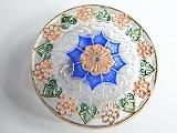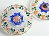 Pt61305  【チェコガラスボタン】模様いろいろ・中央に一輪周りに六輪の花(青緑に赤地、周囲は金)・大(3.15cm)  450円