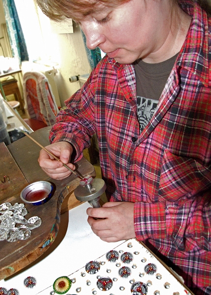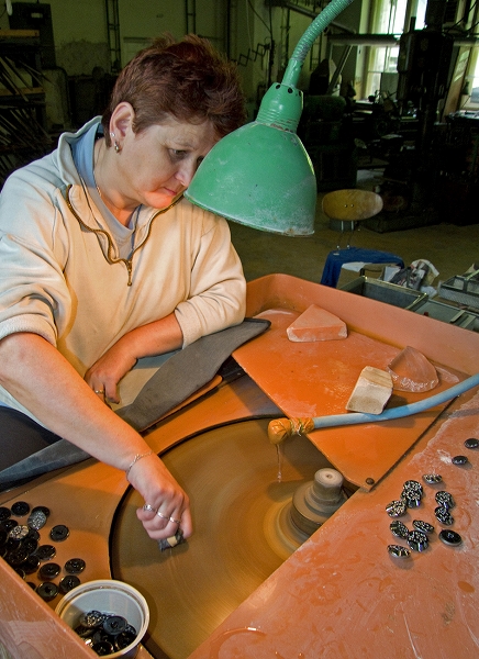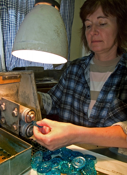 (形押しされたベルト状につながったボタンから、一つ一つを取り出して、周囲のバリを削り取ります)